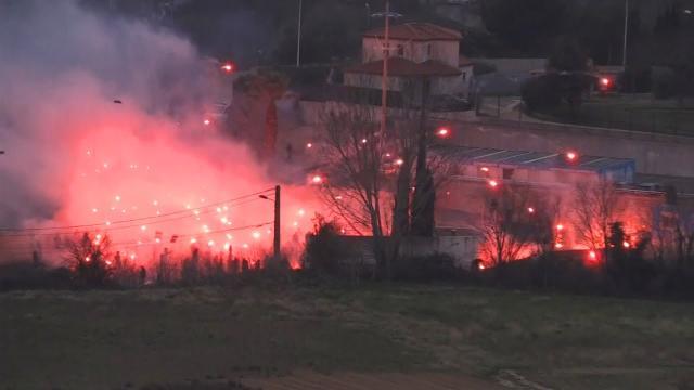 在大门倒下之后,大约有50-100名球迷冲入了基地,并不是全部人。面对试图用催泪弹等手段阻拦他们的安保力量,球迷投掷石块、燃烧瓶,释放烟花。据邻近住宅区的居民说,马赛训练基地就像发生了火灾。红色烟云升起,球迷释放的烟花甚至把一颗柏树点燃冒烟了。